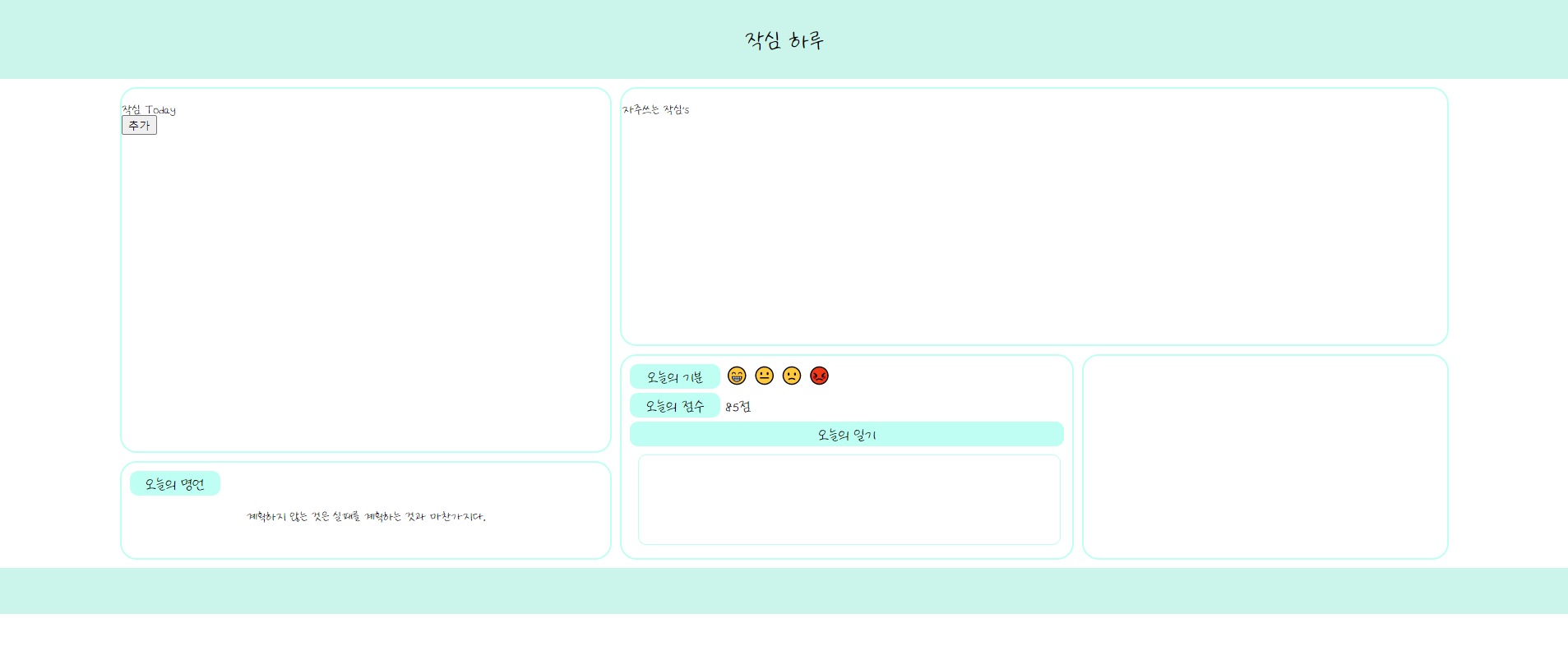 오늘의 명언 시간이 지날때마다 명언이 바뀌게끔 설정 x 작심 추가하기 물주기 햇빛 영양제 추가 작심 하루 작심 Today 추가 자주쓰는 작심's 오늘의 명언 성공이란 넘어지는 횟수보다 한 번 더 일어서는 것이다. 오늘의 기분 😁 😐 🙁 😡 오늘의 점수 85점 오늘의 일기 위처럼 오늘의 명언 text 부분이 시간이 지나면 바뀐다. 앨리스 SW 엔지니어 트랙/스터디 2023.03.31